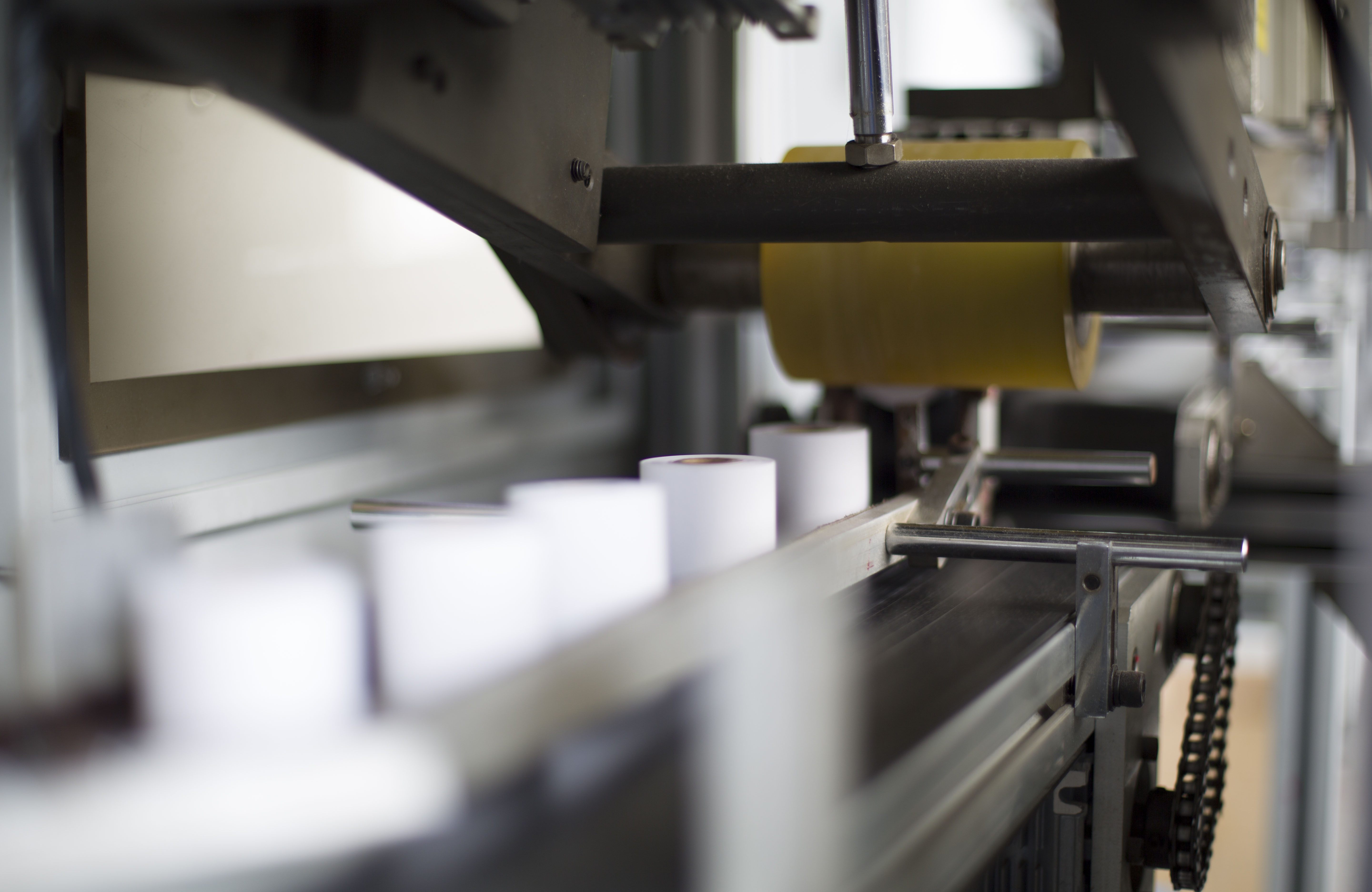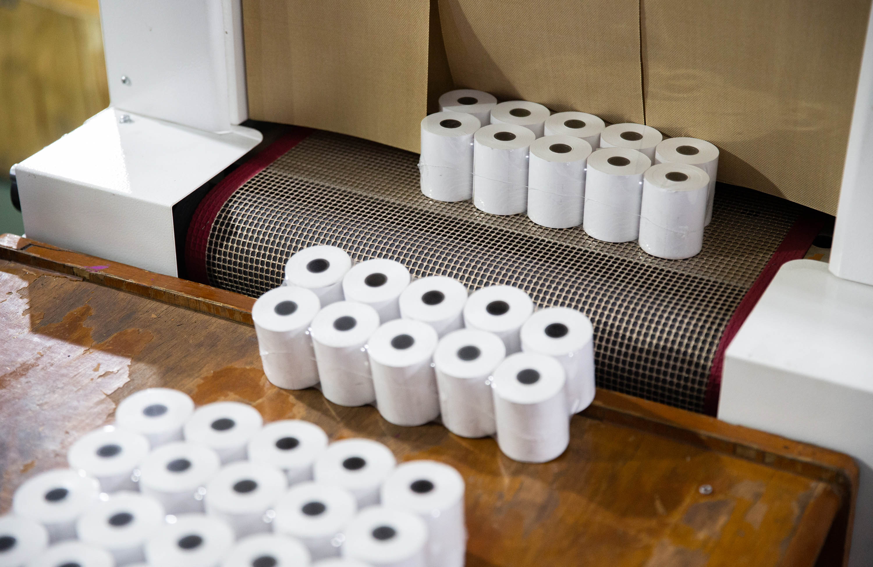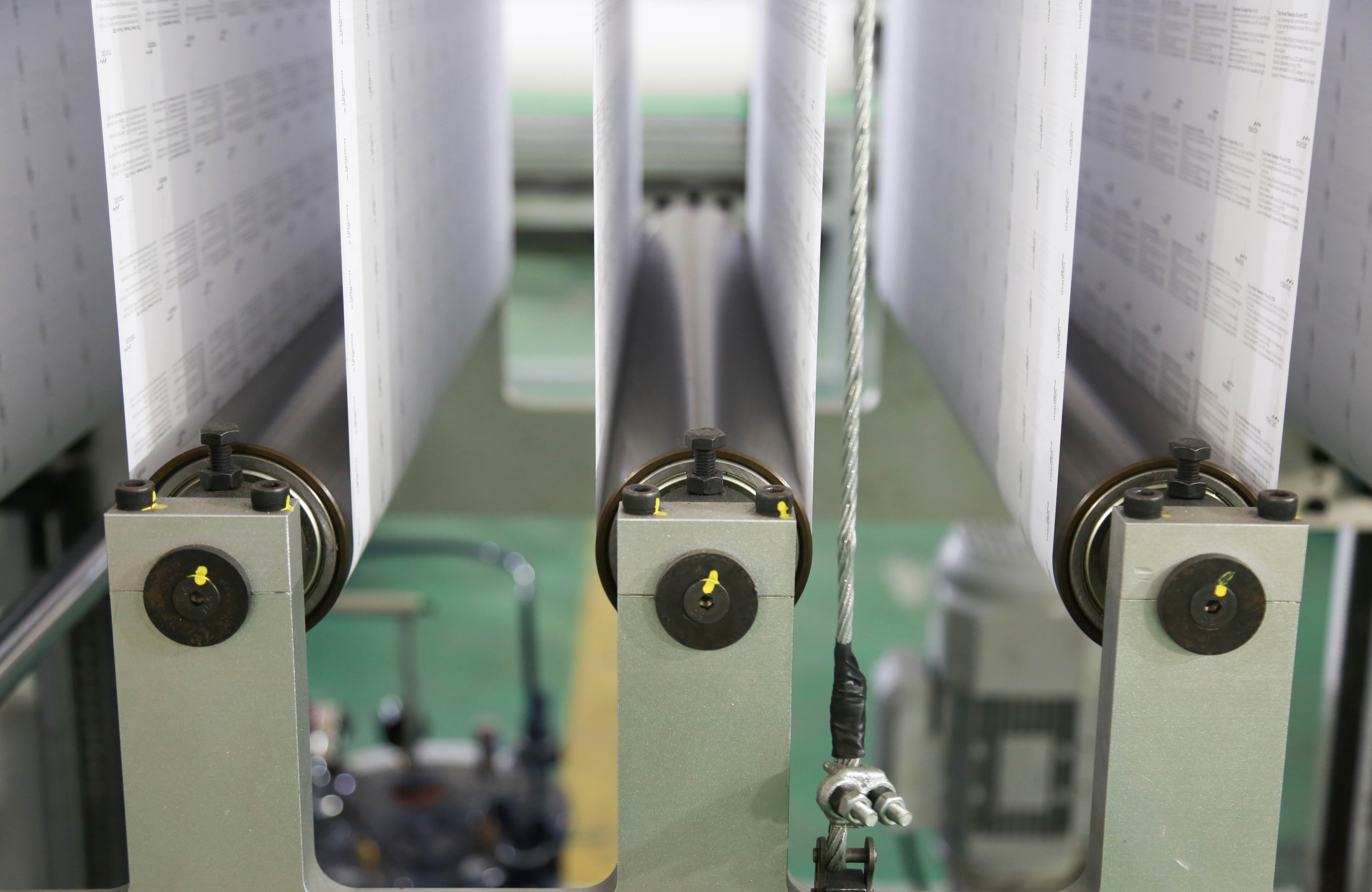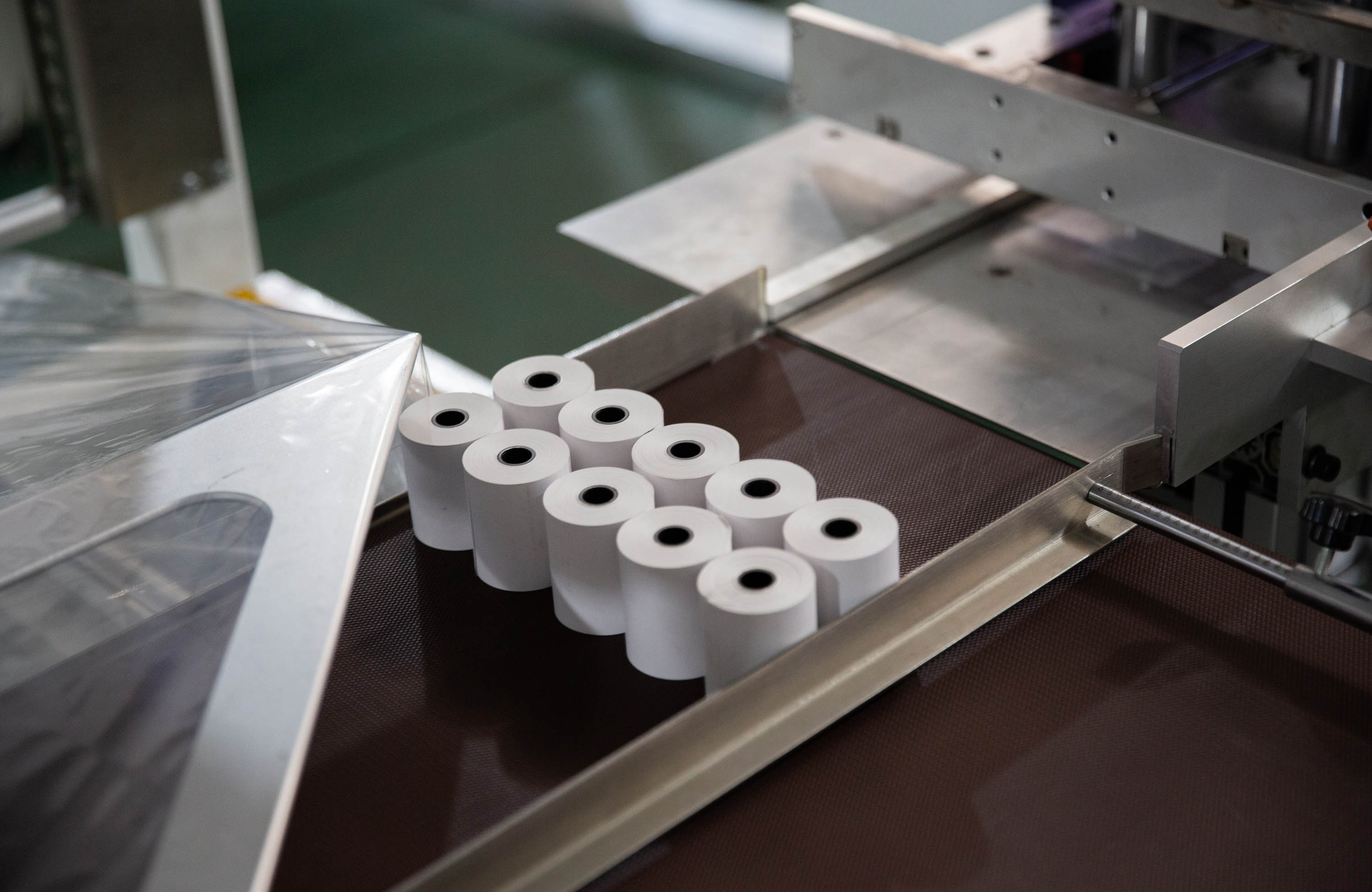 - Vollautomatische Produktionslinie für vorgedruckte Thermopapierrollen: Drucken, Schneiden, Wickeln, Gruppieren und Schrumpfverpackung in einer Linie.